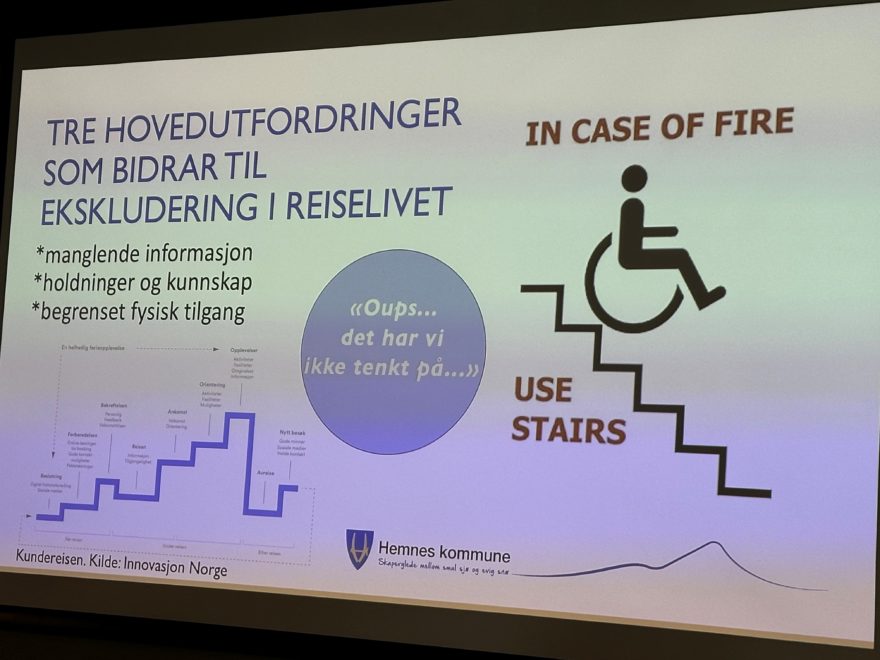 Ofte tror mange reiselivsaktører at utfordringene er så store at de sier nei til besøkende som trenger litt ekstra tilrettelegging. Årsaken til dette er ofte manglende kunnskap om behovene og redsel for å trå feil. Det aller viktigste budskapet fra samlingen er at vi må bli flinkere til å snakke sammen, tørre å stille spørsmål, være løsningsorienterte og ved å prøve, finne ut at inkluderende reiseliv ikke er så vanskelig. Ofte er det små grep som skal til, og tilrettelegging for gjester med funksjonsnedsettelser hever kvaliteten og sikkerheten på reisemålet for alle reisende.