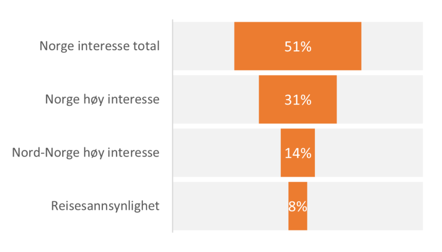 I de fem ikke-europeiske markedene kan 38% tenke seg å reise til Nord-Norge og 10% til Svalbard. Det er litt høyere interesse for Canada og Island, og lik interesse for Nord-Sverige som for Nord-Norge.