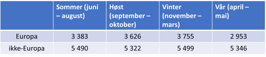 Gjennomsnittlig døgnforbruk er kr 3 429 for de europeiske markedene, det aller høyeste av målgruppene. Det er 443 kroner over det totale snittet. Det er svært store forskjeller i forbruk, sammenlignet med de ikke-europeiske markedene.