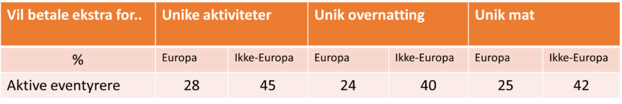 Aktive eventyrere er de mest betalingsvillige (sammen med Grønne utforskere i de ikke-europeiske markedene), både når det gjelder overnatting, aktiviteter og gode matopplevelser. Betalingsviljen er betydelig høyere i de ikke-europeiske markedene.