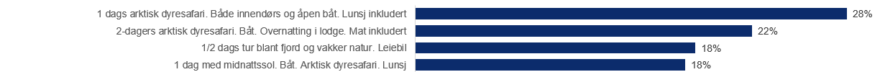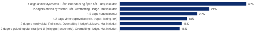 I de europeiske markedene kan 39% tenke seg å reise til Nord-Norge og 23% til Svalbard. Island er den mest interessante arktiske destinasjonen, etterfulgt av Canada og Nord-Norge. Aktive eventyrere har høyest interesse av alle målgruppene for destinasjoner som Svalbard, Grønland, Alaska, og svensk og finsk Lappland.