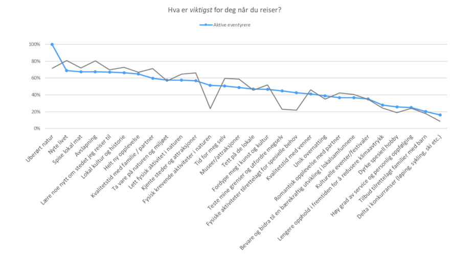 For målgruppen Aktive eventyrere er det spesielt viktig å reise til steder hvor naturen er hovedfokuset. De ønsker å oppleve uberørt natur, og de er generelt interesserte i friluftsliv, helse og sport. De er den målgruppen som ønsker flest aktiviteter og som ønsker høyest fysisk aktivitet. Aktiviteter må gjerne være fysisk krevende og de scorer langt over gjennomsnittet når det gjelder ønske om å teste sine egne grenser og utfordre seg selv. De er også opptatte av at fysiske aktiviteter skal være tilrettelagt spesielle behov. De ligger også over gjennomsnittet når det gjelder å dyrke en spesiell hobby og delta i konkurranser, og de er mindre opptatt av å slappe av, ha tid for seg selv, kvalitetstid med familie og besøke museer eller se kjente steder/attraksjoner.