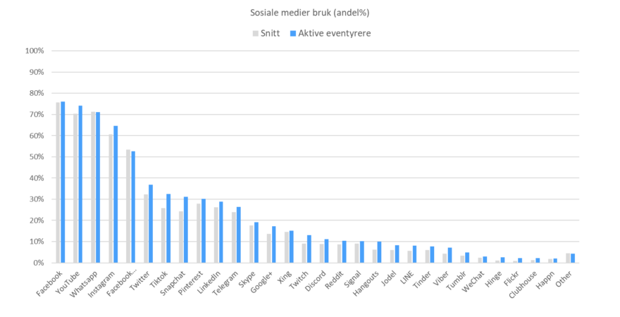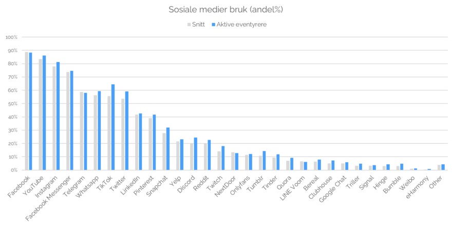 I de ikke-europeiske markedene bruker nesten 9 av 10 i målgruppen Facebook og YouTube. Deretter følger Instagram. Telegram, TikTok og Twitter er mer benyttet (ca. 60%) enn i de europeiske markedene. Også utenfor Europa bruker målgruppen mer tid på sosiale medier enn gjennomsnittet.