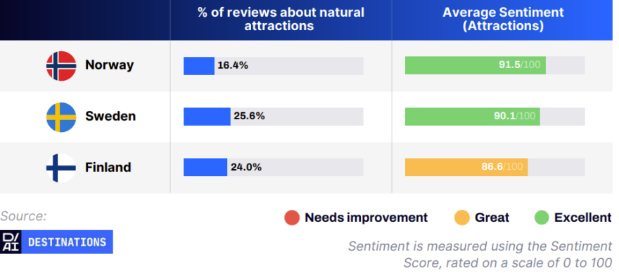 I Norge er den totale tilfredshetsscoren 85/100, men attraksjoner skiller seg enda mer ut med 91,5/100. Britiske og franske reisende fremstår som de mest fornøyde med sine opplevelser. Mer enn 16 % av alle nettanmeldelser om attraksjoner de siste 12 månedene fokuserer på naturområder – spesielt parker (score på 93/100). Selv om de blir sjeldnere anmeldt, er naturskjønne utsiktspunkter og turaktiviteter like populære, og scorer også 93/100.