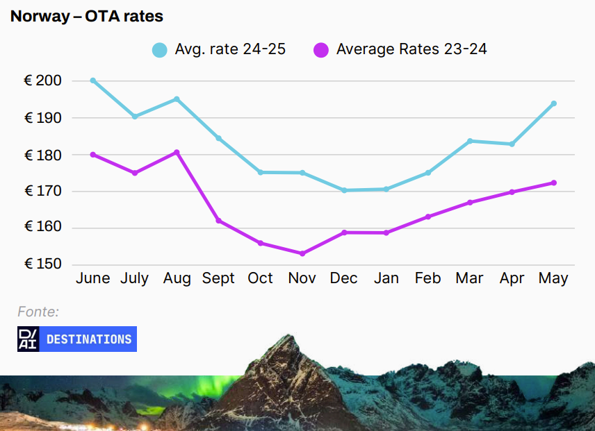 3. OTA-priser og etterspørselstrender – Hotellpriser på online reisebyråer (OTA) har økt, noe som indikerer økende interesse fra det internasjonale markedet. Norge har de høyeste gjennomsnittsprisene og sterkest vekst. Det er en økning i reiser i skuldersesongene (f.eks. mai og september), da mange reisende ønsker å unngå folkemengder og høye priser i høysesongen. Finland skiller seg ut med høyere priser og etterspørsel om vinteren, drevet av opplevelser i Lappland som nordlys og hundekjøring