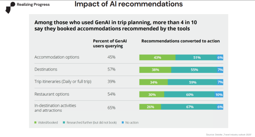 Det tyske markedet er noe avventende og forsiktig, men antall brukere har også der eksplodert i løpet av svært kort tid. De viktigste kildene til reiseinformasjon og inspirasjon er nå online. Bestillinger gjøres i økende grad direkte etter anbefalinger fra AI.