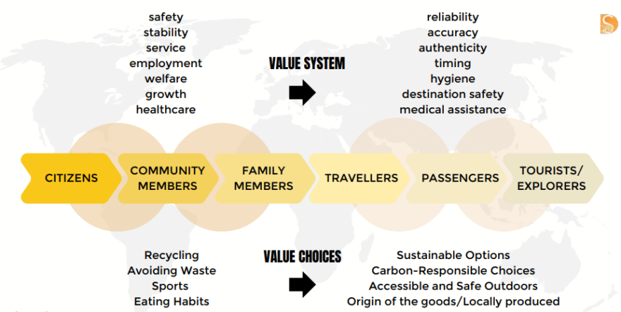 Semeraro snakker videre om viktigheten av verdisystemet. Hvilke verdier har de reisende hjemme? Dette definerer behovene og opplevelsene også på ferie. Verdiene er forskjellige for de ulike partene i verdikjeden.