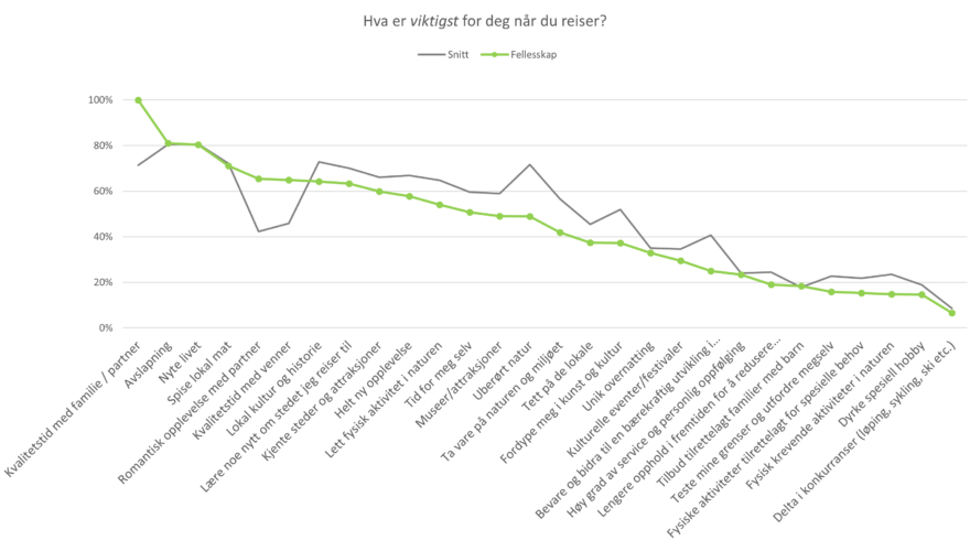 Fellesskapsorienterte er en noe mer generisk målgruppe enn de andre målgruppene, som er mer spisset. Dette fordi de aller fleste ønsker å dra sammen med noen på tur, og ønsker kvalitetstid med familie eller venner. Reisefølge og familieforhold er derfor en avgjørende faktor generelt.