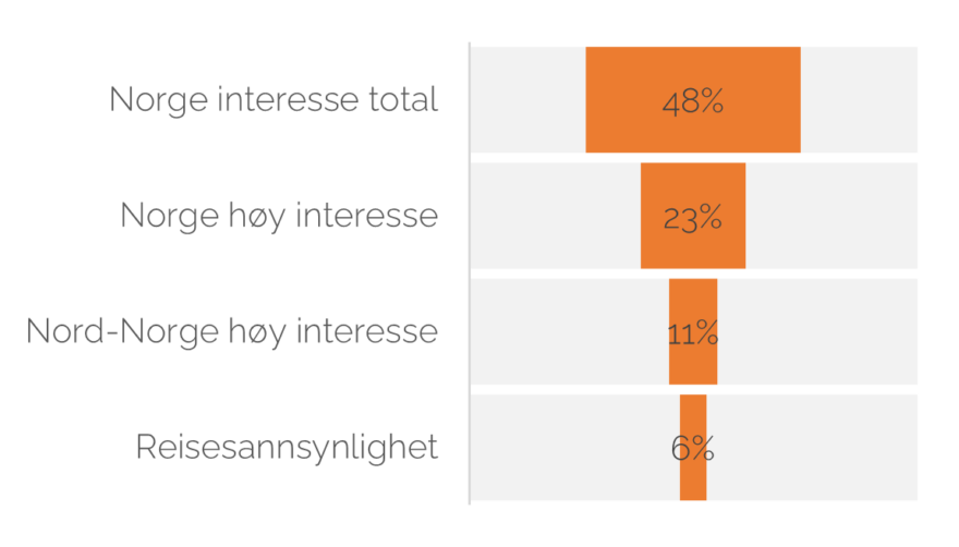 I de europeiske markedene kan 33% tenke seg å reise til Nord-Norge og 17% til Svalbard. Island og Canada er de mest interessante arktiske destinasjonene, men Nord-Norge følger på tredjeplass.