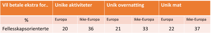 Fellesskapsorienterte ligger på eller litt under snitt når det gjelder betalingsvilje. Betalingsviljen er betydelig høyere i de ikke-europeiske markedene.