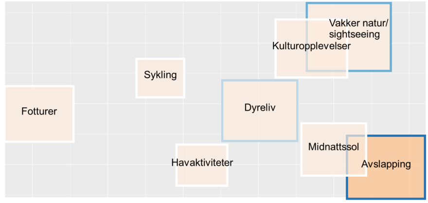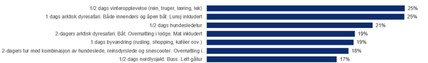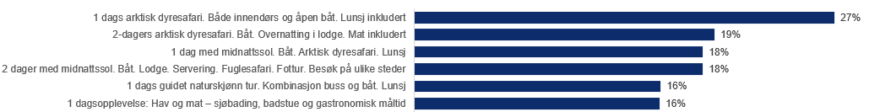 I tillegg scorer de over gjennomsnittet på guidet dagstur i naturskjønne omgivelser (kombinasjon av buss og båt), bading i sjøen med badstue, 2-3 timer byvandring på egen hånd, en dags lett fjelltur uten guide (6-8 km), to-dagers guidet topptur med overnatting i telt/lavvo og mat inkludert, 2-3 timers midnattssoltur i åpen båt, 2-3 timer guidet havkajakk/padlebrett, 2-3 timer bading i sjøen med badstue, 1 dags guidet fjellsykling eller på grus/i terreng (50 – 80 km, med lunsj), og 2-3 timer by-sykling med eller uten guide.