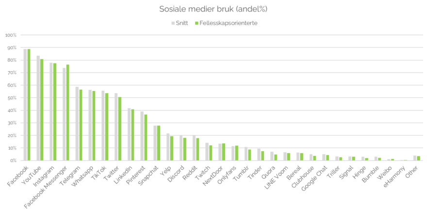 I de ikke-europeiske markedene bruker nesten 9 av 10 i målgruppen Facebook. Deretter kommer YouTube, Instagram og Messenger. Telegram, Twitter og TikTok er mer benyttet enn i de europeiske markedene.