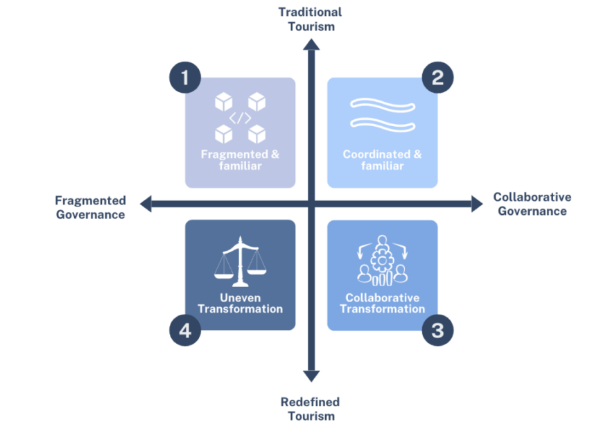 - Samarbeidende transformasjon: Høyt EU-samarbeid og høyt generasjonsskifte i etterspørselen. Dette er den mest optimistiske fremtiden hvor en sterk tilpasning til klimaendringer og en digital agenda fører til en regenerativ og deltakerbasert turisme. Sektoren er innovativ og robust