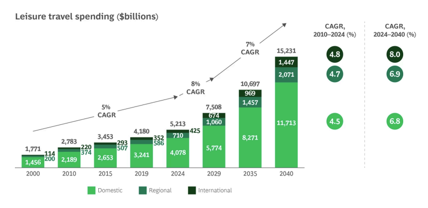 Ifølge en rapport fra Boston Consulting Group forventes det en årlig økning i antall overnattinger på fritidsreiser med 3 – 4% fram til 2040. Forbruket forventes å øke med 7 – 8% per år. Verdien forventes å tredoble seg fra 5 billioner dollar i 2024 til 15 billioner dollar. Denne veksten er i stor grad drevet av en økende middelklasse i fremvoksende markeder og en større preferanse for opplevelser fremfor materielle eiendeler.