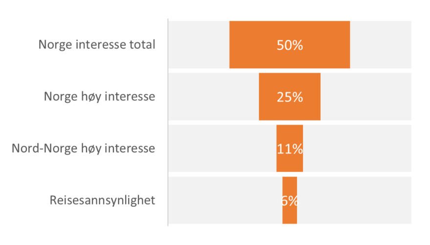 I de europeiske markedene er 50% av Attraksjonsjegere interessert i å reise på ferie til Norge. 11% har høy interesse for å reise til Nord-Norge og reell reisesannsynlighet beregnes til 6% (justert for barrierer mot å reise). 6% har høy interesse for å reise til Svalbard. Tallene er ganske like for de ikke-europeiske markedene: 47 – 23 – 10 – 2. Naturlig nok er sannsynlighet for å reise noe lavere.