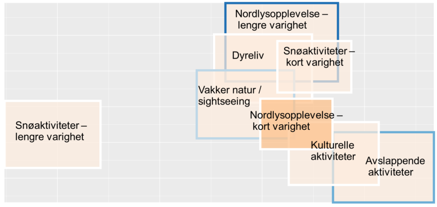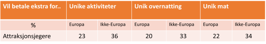 Betalingsvilligheten ligger på eller litt under gjennomsnittet for aktiviteter, overnatting og mat. Betalingsviljen er betydelig høyere i de ikke-europeiske markedene.