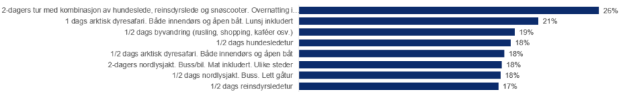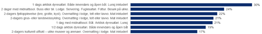 I tillegg er de overrepresentert på aktiviteter som 2 timer taubane med lunsj på toppen, halv dags byvandring, halv dags arktisk dyresafari, to-dagers kulturell utflukt med besøk på ulike museer, en-dag guidet fjellklatring, en halv dag guidet arktisk snorkling/dykking, halvdags havfiske, samt halvdagstur på sykkel (grus/terreng med eller uten guide).