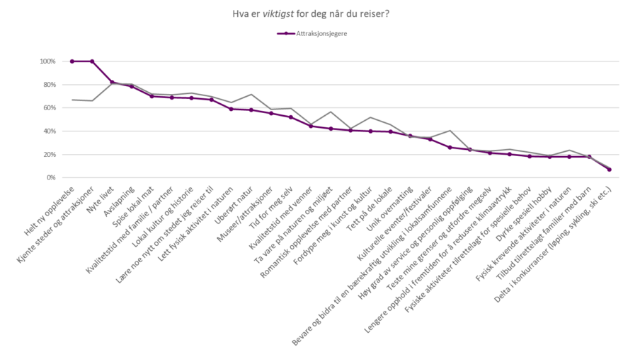 For Attraksjonsjegere er det spesielt viktig å oppleve kjente steder og attraksjoner, ha helt nye opplevelser (once-in-a-liftetime) og kunne krysse av på sin «bucket-list». De liker å slappe av og nyte livet. De er under gjennomsnittlig opptatt av bærekraft. De er også under gjennomsnittlig interessert i uberørt natur, aktiviteter i naturen, å fordype seg i kunst og kultur, komme tett på lokalbefolkningen, og å ha tid for seg selv.