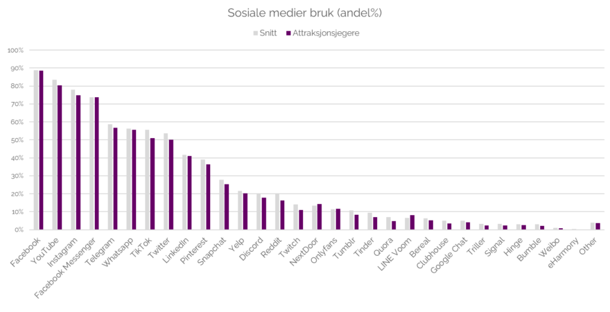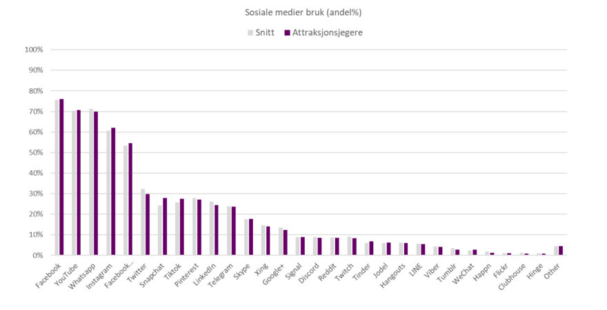 I de ikke-europeiske markedene bruker nesten 9 av 10 i målgruppen Facebook. Deretter kommer YouTube, Instagram og Messenger. Telegram, TikTok og Twitter er mer benyttet (over 50%) enn i de europeiske markedene.