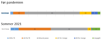 - Flere erfarer turistunderskudd nasjonalt, lokalt og ved eget bosted enn i 2018 og 2019. 42% mener volumet er passe ved eget bosted, mens 9% mener det er for mange turister og 38% mener det er for få (+10% siden 2019)