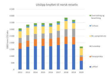 Klimagassutslipp knyttet til norsk reiseliv var 3,7 millioner tonn CO2 i 2019. Passasjerbåter og cruiseskip sto for mer enn 1,1 millioner tonn.