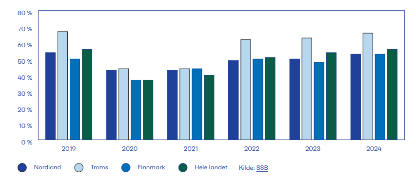 Veksten var størst i Bodø (34%), drevet av blant annet statusen som Europeisk kulturhovedstad i 2024 og yrkesreiser. Vesterålen/Narvik (23%) og Tromsø (18%) fulgte tett etter. Helgeland var den eneste regionen med en nedgang, hovedsakelig på grunn av færre yrkesreisende etter redusert anleggsaktivitet knyttet til Freyr i Rana.