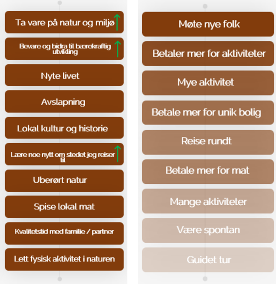Disse er generelt interessert i friluftsliv, helse, mat og natur og miljø. De ønsker mange aktiviteter i uberørt natur, som gjerne er fysisk krevende. De har høy interesse for vandring, sykling, aktiviteter på eller i havet, nordlys, samt snøaktiviteter av lengre varighet.