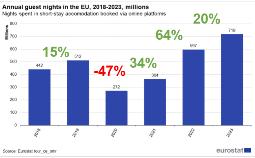 Det har vært en kraftig økning av korttidsutleie over hele Europa. Dette påvirker byene først og fremst da det bidrar til overturisme, begrenser tilgjengeligheten av boliger, gir økte priser, samt reduserer lokalbefolkningens trivsel. Markedet har utviklet seg fra den opprinnelige tanken om delingsøkonomi til en profesjonell sektor med kommersielle verter. Tilbudene tilsvarer hotellenes og det er kommet et nytt lag av formidling. Reguleringer har etter hvert blitt mer og mer vanlig. Samtidig er spredning av turisme til nabolag med få turister ofte blitt identifisert som en strategi for å avhjelpe
