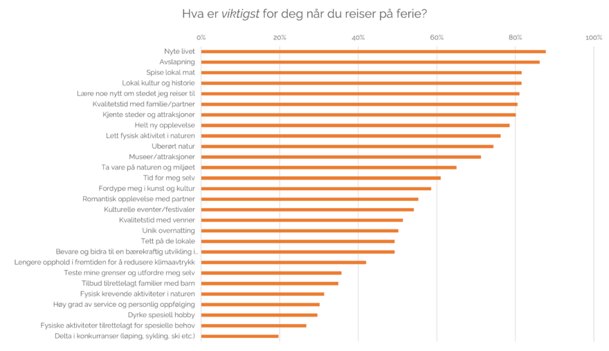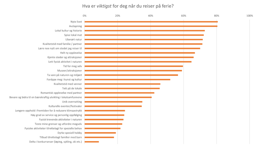 Å slappe av og nyte livet er det aller viktigste når man skal på ferie. Lokal mat og lokal kultur/historie scorer også høyt. Minst viktig er det å delta i konkurranser og å dyrke spesielle hobbyer. Prioriteringene er ganske like i begge undersøkelser, men vi ser at målgruppene i USA, Australia og de tre asiatiske markedene gjennomgående har krysset av for flere ting som er viktige for dem (derfor høyere prosenter).