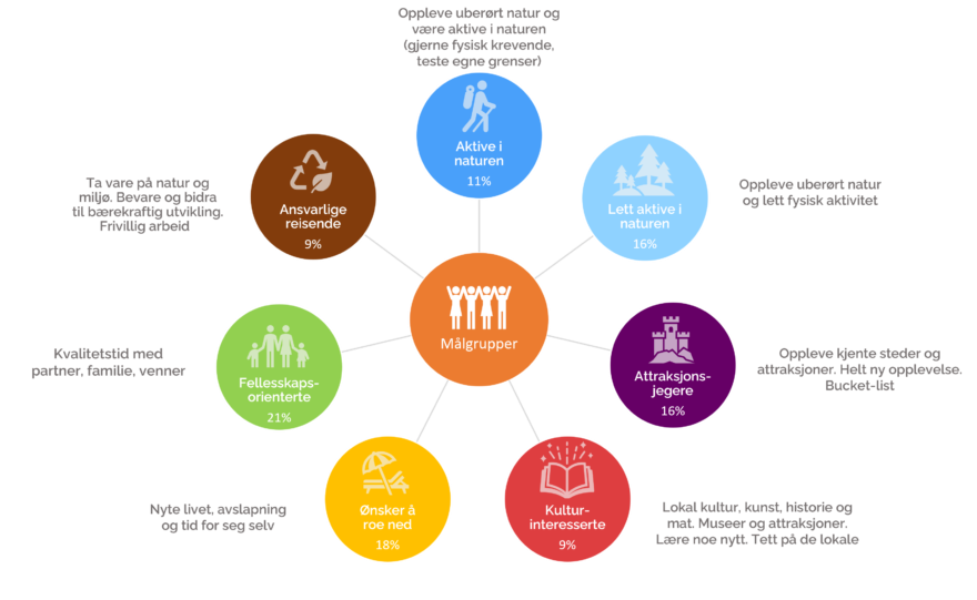 Analysen har avdekket 7 hovedmålgrupper. Vi viderefører målgruppene Fellesskapsorienterte, Kulturinteresserte, Roe ned og Attraksjonsjegerne / Icons. Natur/Outdoors blir delt i to Lett Aktive i naturen og Aktive i naturen. I tillegg har vi fått Ansvarlige reisende.