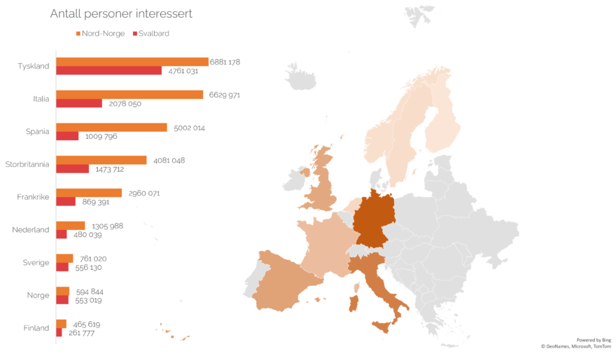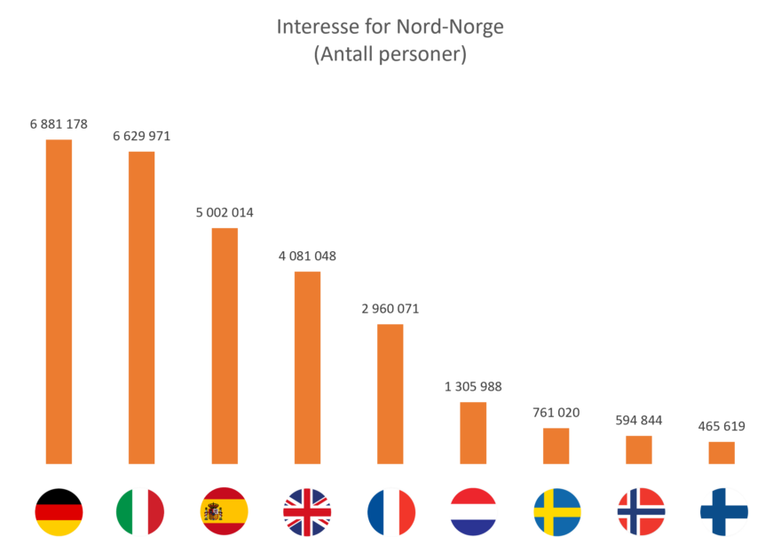 På grunn av høye befolkningstall er det Tyskland, Italia og Spania som har det høyeste antallet interesserte. Den aller høyeste interessen for å besøke Nord-Norge har nordmenn, tett etterfulgt av Italia og Spania. Til tross for at interessen er noe lavere i Frankrike, Storbritannia og Tyskland, er det fortsatt mange mennesker som er interessert, og bør derfor ikke ekskluderes. Det kan indikere at kommunikasjonen muligens bør spisses noe mer.
