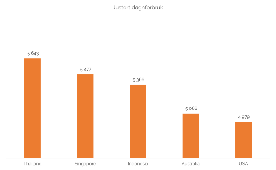 Forbruket i de ikke-europeiske markedene er mye høyere. Aller høyest forbruk har de thailandske gjestene med kr 5 643 per døgn, og lavest de amerikanske gjestene med kr 4 979. Også her er det i Mindshares undersøkelse spesifisert at flykostnader er ekskludert.