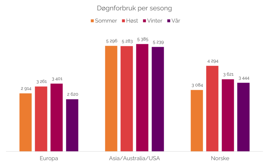For de norske og europeiske reisende er forbruket høyere høst og vinter, enn vår og sommer. Aller høyest forbruk antas norske høstgjester å ha med kr 4 294 per døgn. Utenlandske vintergjester legger i snitt igjen kr 3 401 per døgn.