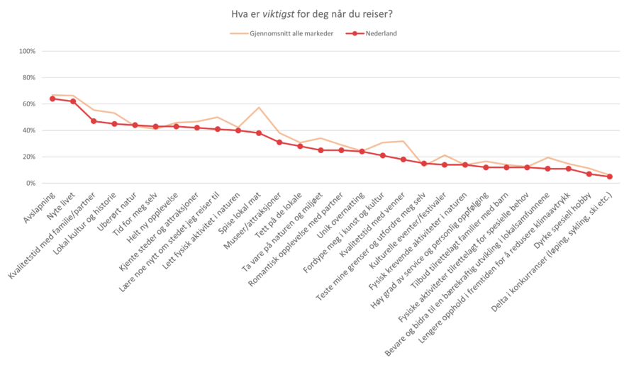 Spesielt synes nederlenderne at lokal mat, kvalitetstid med venner, kunst og kultur, og lære noe nytt er mindre viktig enn gjennomsnittet. De scorer også lavere på at det er viktig å ta vare på natur og miljø, og ønske om å bidra til bærekraftig utvikling i lokalsamfunnene de besøker.