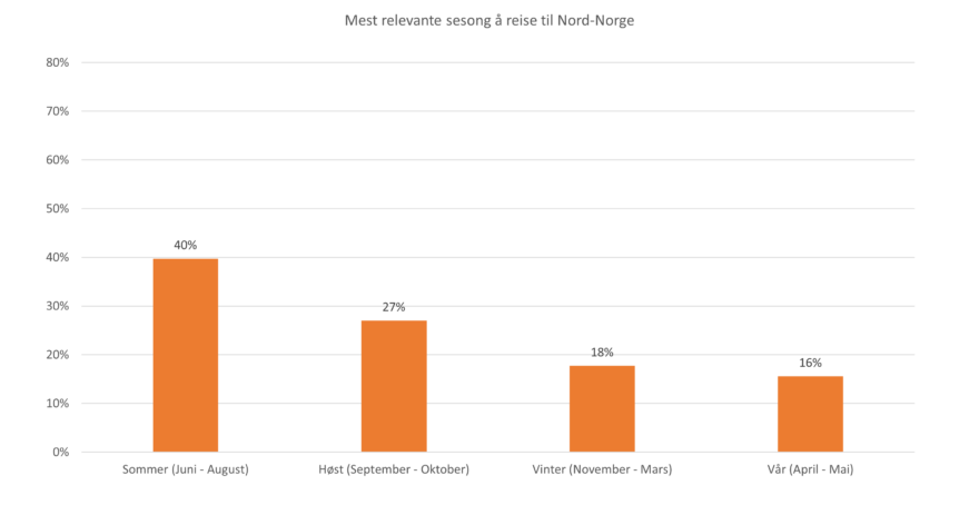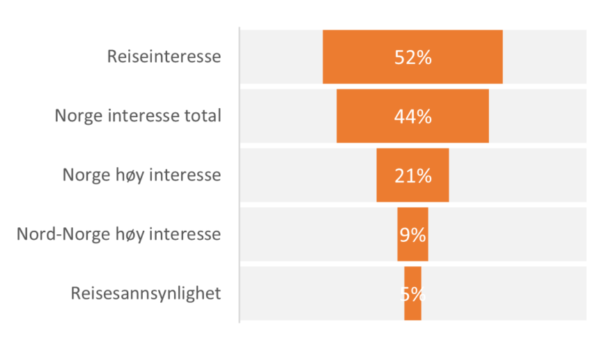 44% av det nederlandske markedet er interessert i å reise på ferie til Norge, som er høyest av de nordiske landene. 9% har høy interesse for å reise til Nord-Norge og reell reisesannsynlighet beregnes til 5% (justert for barrierer mot å reise). 3% har høy interesse for å reise til Svalbard. Det er Naturoppdagere som har størst interesse for Nord-Norge, mens de Aktive eventyrere har størst interesse for Svalbard.