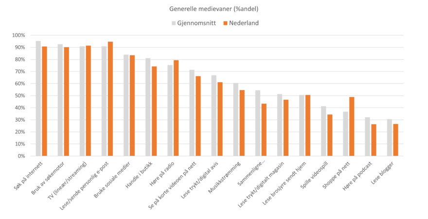 Nederlenderne ligger omtrent på gjennomsnitt både i bruk av internett, søkemotorer og sosiale medier. De shopper mer på nett enn gjennomsnittet.
