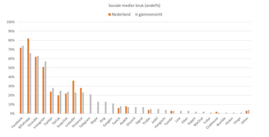82% av nederlenderne bruker Whatsapp, hvor de også ligger høyt over gjennomsnitt. Deretter kommer Facebook og YouTube. De bruker LinkedIn mest av alle markeder Mindshare har målt. De ligger under snitt når det gjelder bruk av Instagram, Twitter og TikTok.