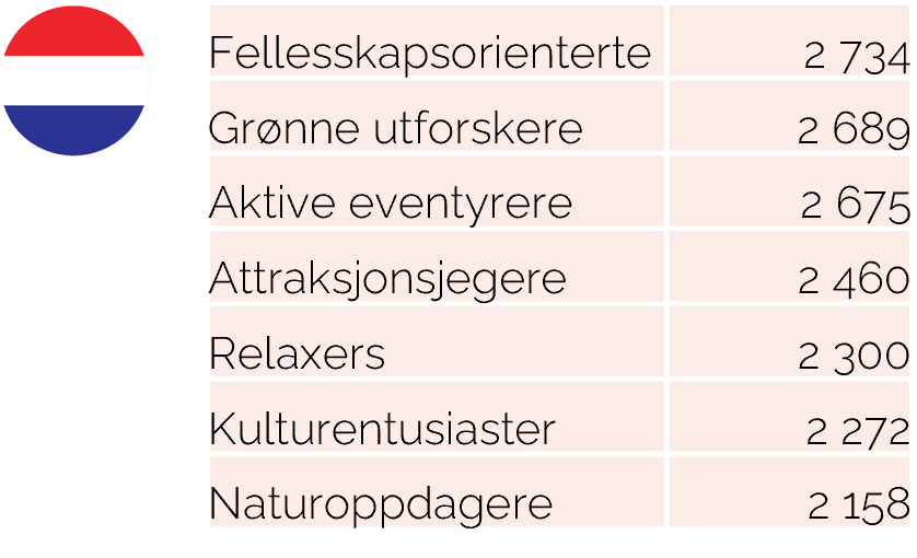 Målgruppene Relaxers og Naturoppdagere er de største, og utgjør hver 20% av det nederlandske markedet.