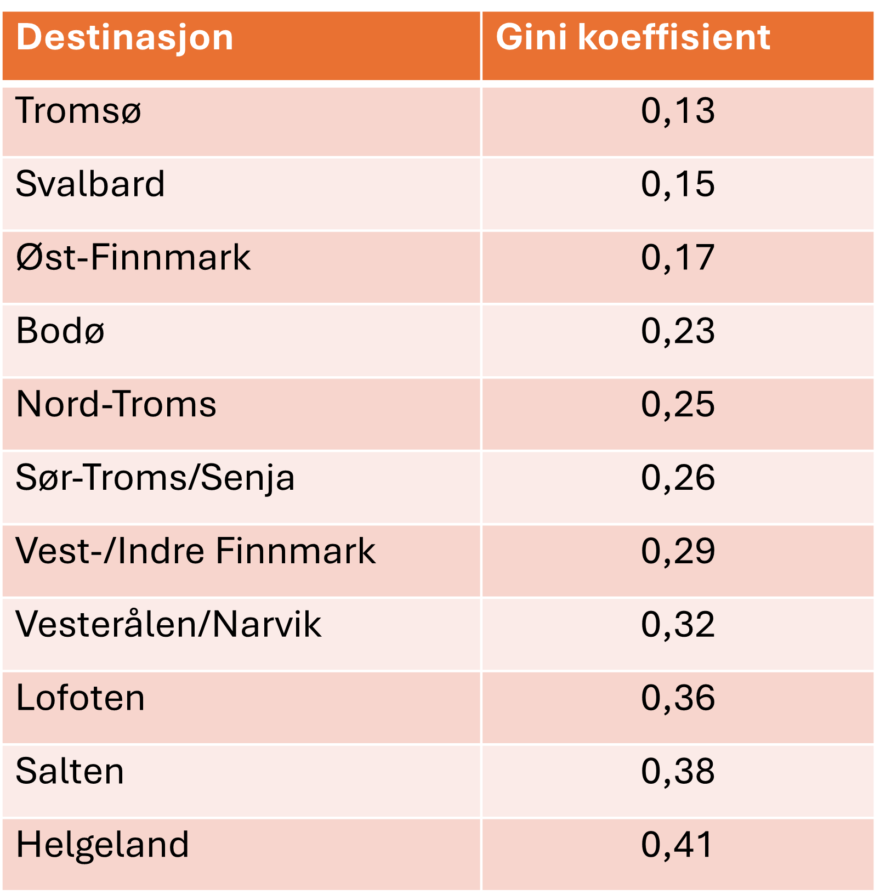Gini indeksen forteller hvor jevn turismeaktiviteten er fordelt over året. Verdien varierer mellom 0 (stabil aktivitet gjennom året) og 1 (store forskjeller mellom rolige og travle perioder).