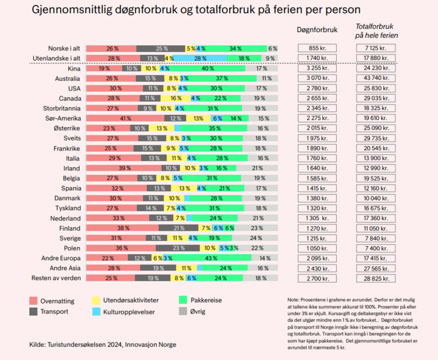 De som har reist lengst, bruker mest penger. Kina, Australia, USA, Canada og Storbritannia har høyest gjennomsnittlig døgnforbruk (transport til Norge er ikke inkludert). En svekket kronekurs de siste årene har styrket Norges konkurranseevne. Mer enn 1 av 4 utenlandske feriereisende kjøper hele eller deler av ferien som en pakkereise. Det store flertallet av pakkene inneholder overnatting (88%) og/eller transport i Norge (59%).