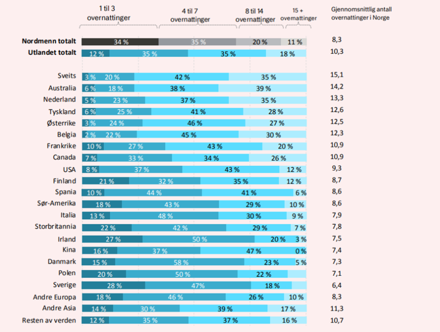 Gjennomsnittlig oppholdstid er omtrent på samme nivå som i 2019 for utenlandske feriereisende totalt sett. Mange reisende fra Sveits, Australia, Nederland, Belgia, Tyskland og Østerrike er i Norge 15 netter eller mer, særlig i sommersesongen.
