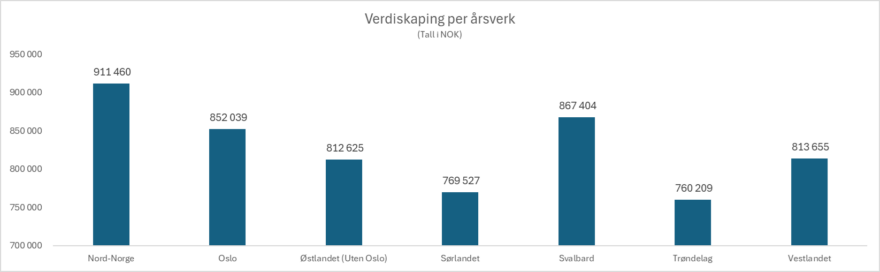 Regionen skiller seg ut når det gjelder verdiskaping per innbygger. Utenom Svalbard (200 000 kroner per innbygger) og Oslo (43 000) er Nord-Norge den ledende landsdelen med et snitt på over 30 000 kroner per innbygger, noe som er betydelig høyere enn landsgjennomsnittet på ca. 21 000 kr. Sammen med Trøndelag og Sørlandet har Nord-Norge økt sin andel av den nasjonale verdiskapingen med 2,4 prosentpoeng siden 2018.