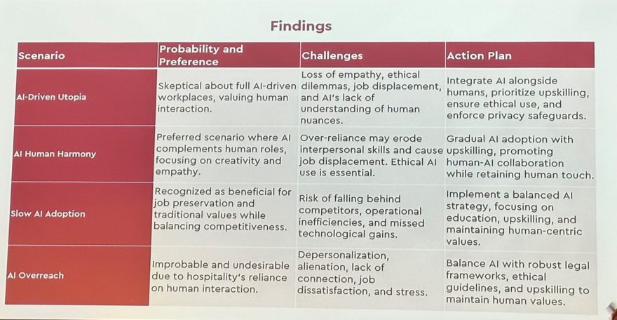 Vil større mengder data, nye informasjonskilder og AI føre til et lavere servicenivå? Vil kundereisen, slik vi kjenner den, forsvinne? Vil det bli færre jobber og mindre sosial interaksjon? Hvordan skape attraktive arbeidsplasser i næringen? Hva kan bli det neste – hva ville vi gjort nå om vi hadde visst? Hvordan vil mennesker og maskiner endre reiselivet i den femte industrielle revolusjonen?