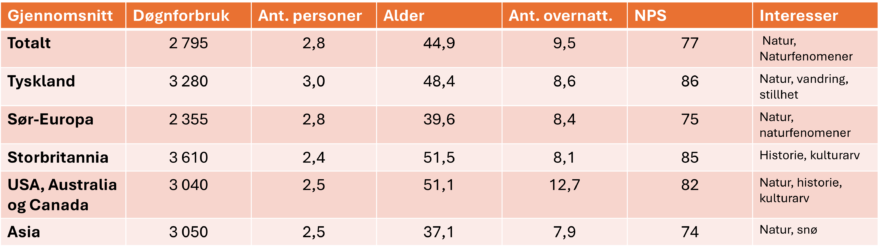 Sammenlignet med andre vinterturister besøker nordlysgjestene i større grad Norge for første gang, har et høyere døgnforbruk, oppholder seg nesten to overnattinger lengre, besøker flere regioner, og deltar på dobbelt så mange organiserte aktiviteter.