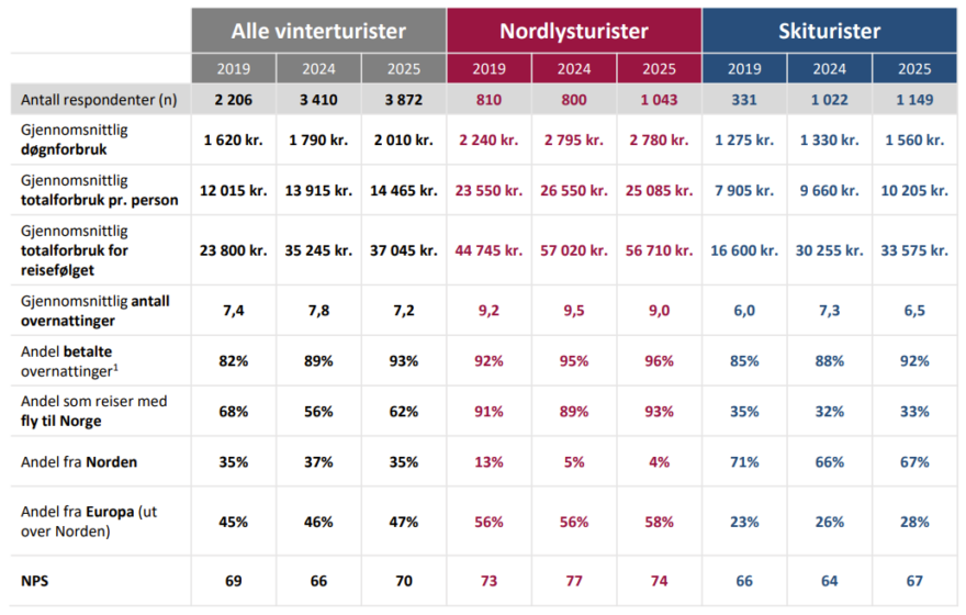 - Nordlysturistene har et betydelig høyere gjennomsnittlig døgnforbruk enn andre vinterturister, kr 2 780 (en liten nedgang siden 2024)