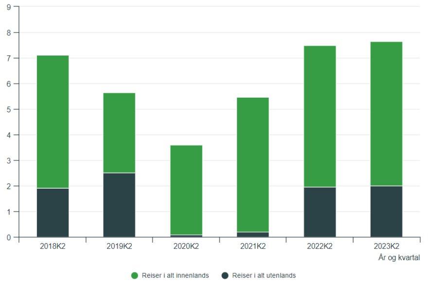 Allerede fra påska 2022 var nordmenns reisevaner så godt som tilbake slik de var før pandemien. Sommeren 2023 har ferien vært prioritert selv om de fleste har kjent på en trangere økonomi. I andre kvartal reiste vi mer enn noen gang tidligere i eget land, og like mye utenlands som før pandemien. Kortere reiser i Europa foretrekkes foran lengre fjerntliggende destinasjoner. Den store forskjellen fra tidligere har vært at bestillingene skjedde senere enn normalt. Noe av dette kan forklares med en dårlig sommer med mye nedbør i store deler av landet.