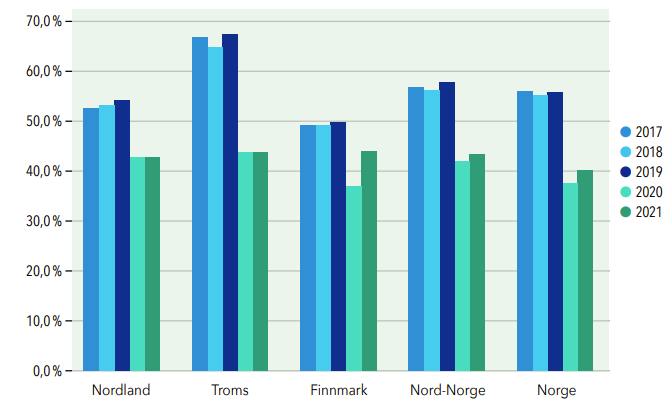 I perioden fra 2017 til 2021 hadde Nord-Norge en nedgang i kapasitetsutnyttelse på 13,5%. Fra 2020 til 2021 var det en økning på 1,3%.