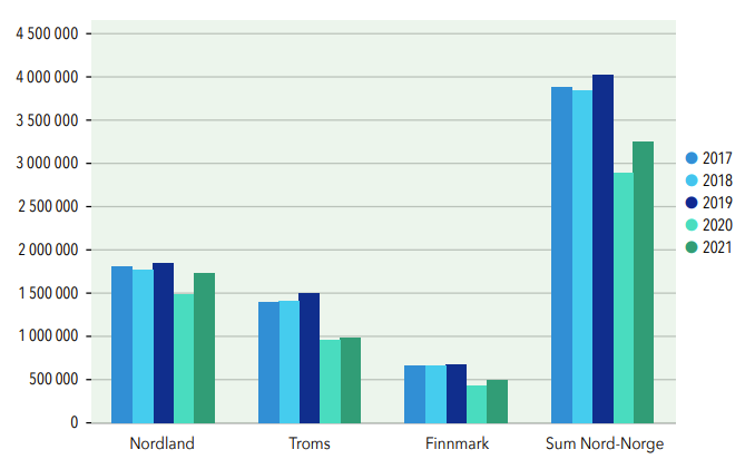 I 2021 hadde Nord-Norge 3 247 744 kommersielle overnattinger, en økning på 12,4% sammenlignet med 2020.