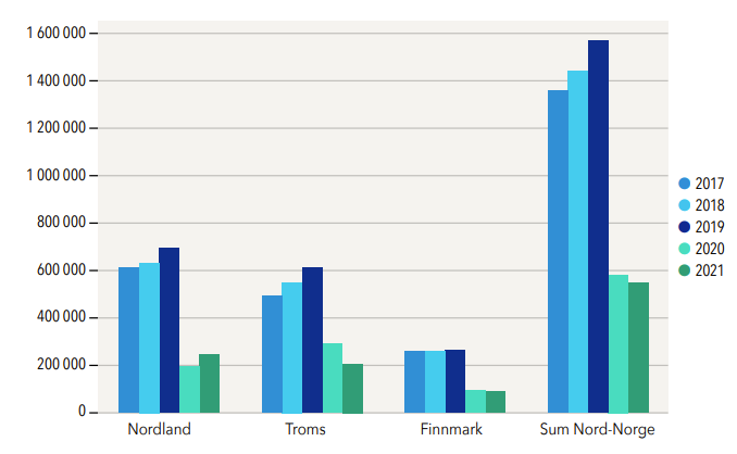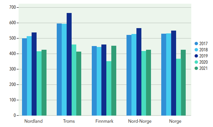 Fra 2020 til 2021 var det en nedgang for Nord-Norge med 1,3%. Nedgangen for Troms var på over 10%, mens Nordland og Finnmark hadde en økning på hhv. 2,4% og 7,4%. Svalbard hadde en økning på 7%.