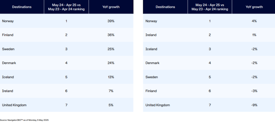 De største markedene er USA, Storbritannia og Tyskland, både i søk og faktiske bestillinger. Høyest vekst i søk er det imidlertid fra Kina, Japan, Norge, India og Polen. Topp tre reisemål er Spania, Storbritannia og Italia, med Norge på niende plass og 4% økning i antall bookinger i perioden mai’24 – april’24 sammenlignet med samme periode året før. Norge har høyest økning i reisesøk med 39%, tett etterfulgt av Finland med 36% og Georgia med 33%.